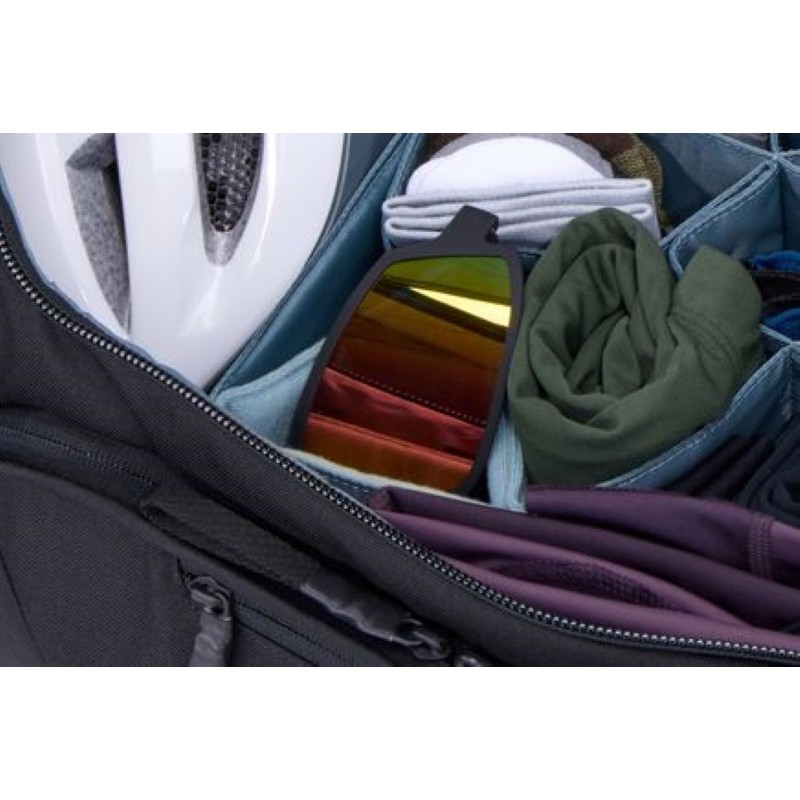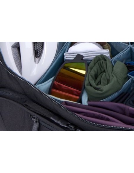 Organizzazione perfetta: scomparti dedicati per scarpe, casco, indumenti sporchi e accessori da ciclismo.