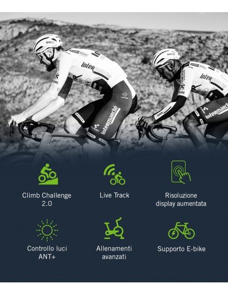 • Climb Challenge 2.0: prevede le salite in arrivo sul percorso, offrendo informazioni in tempo reale e dati di percorrenza. Questa funzione aiuta i ciclisti a intraprendere anche i percorsi più impervi con maggiore confidenza.