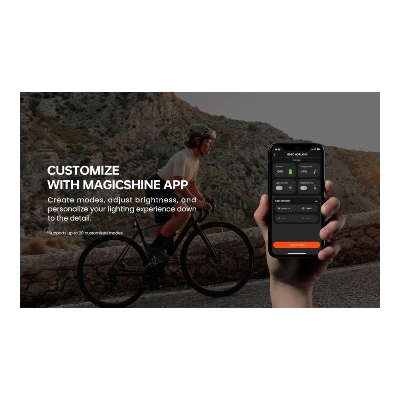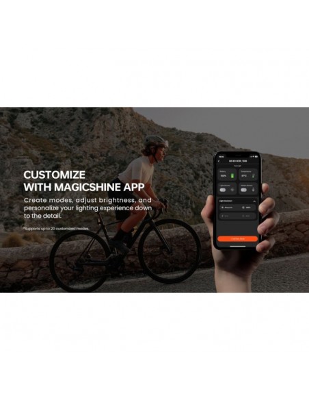 Dopo la connessione di HORI 1300 all'APP MAGICSHINE, la luminosità e il numero di modalità possono essere regolati individualmente e in base alle proprie esigenze. Il codice dell'APP (IOS e Android) viene fornito con la consegna.