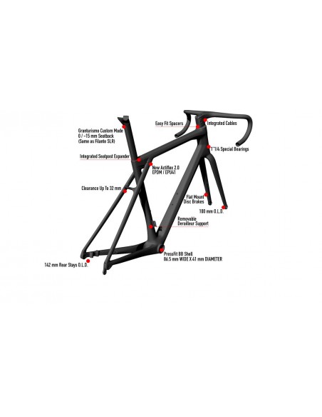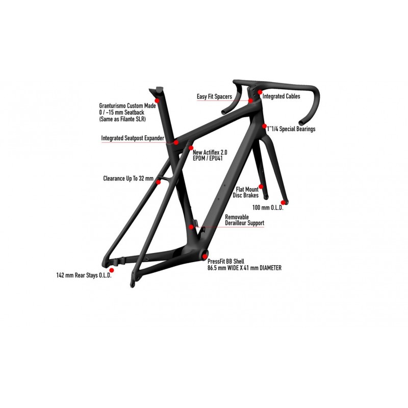 Il mix di carbonio di Granturismo SLR è l’HUS-MOD integrato con il Liquid Crystal Polymer, la speciale fibra usata tra le maglie di carbonio che aggiunge elasticità sul piano verticale e allo stesso tempo aumenta la rigidità torsionale. Questa soluzione è anche ampiamente usata sui prodotti di alta gamma come Filante SLR e Wilier 0 SLR.