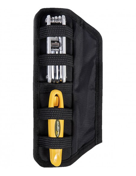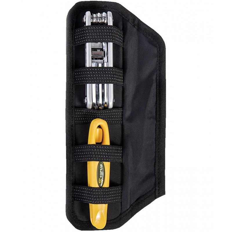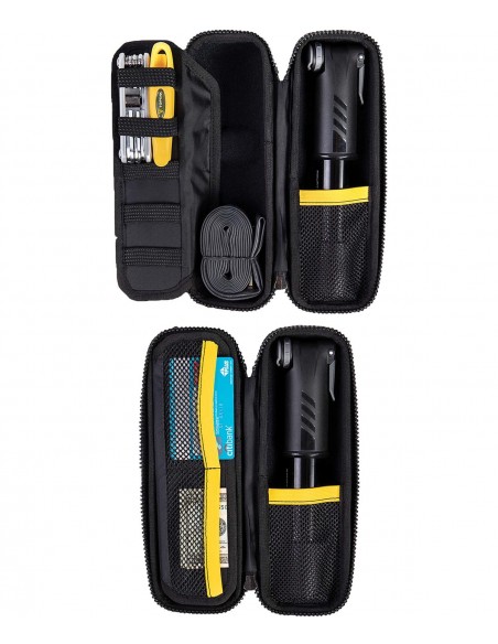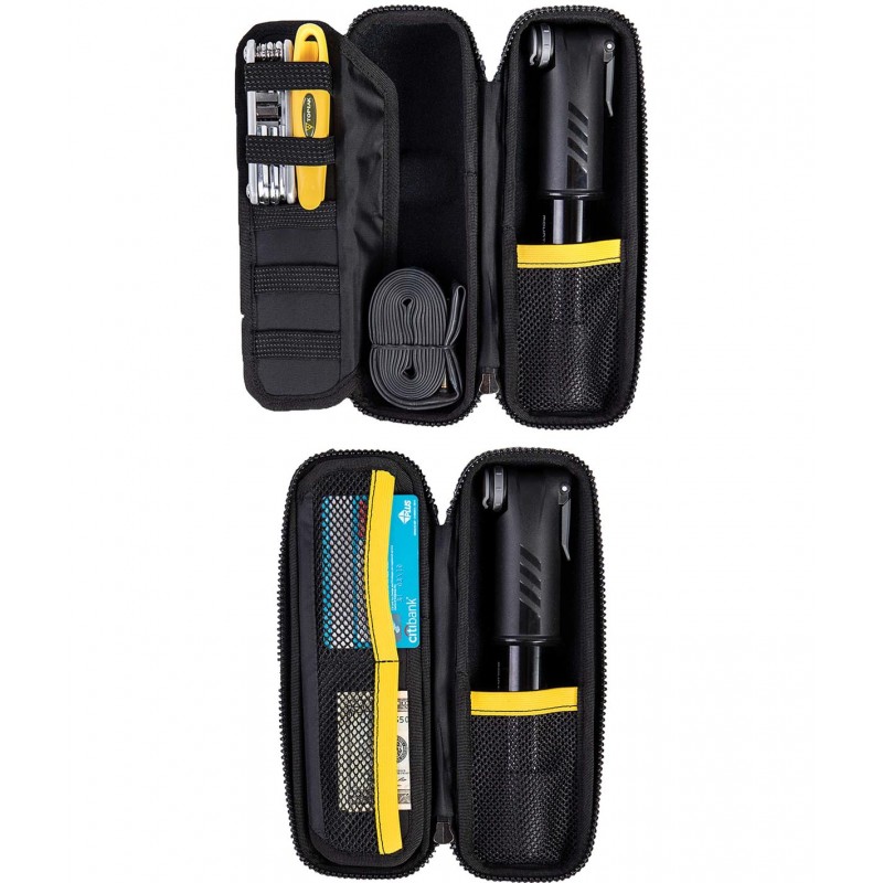 Custodia portautensili ad ampia capacità per portaborraccia. La tasca interna in tessuto a maglia e l'organizer rimovibile permettono di mantenere gli utensili saldamente al proprio posto. Può contenere una camera d'aria MTB 29" / 27.5" / 26" o road 700cc e una mini pompa fino a 22cm.