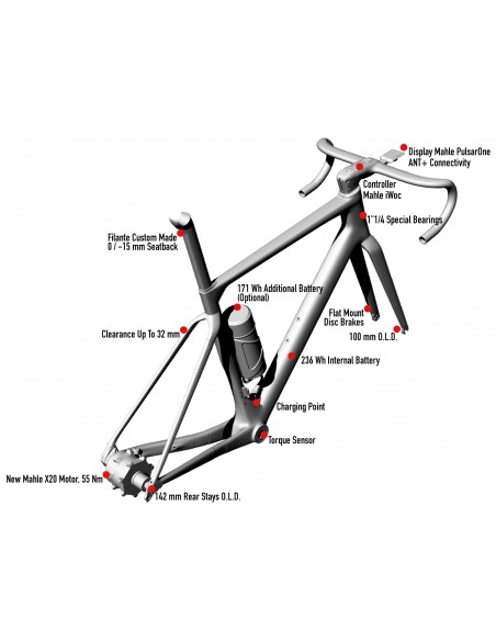 - Batteria integrata: La batteria integrata nel tubo obliquo offre un'autonomia di 236 Wh, ma può essere estesa con una batteria aggiuntiva a forma di borraccia per aggiungere altri 171 Wh al sistema. Il software e l'applicazione disponibili consentono di gestire, monitorare e impostare il sistema.