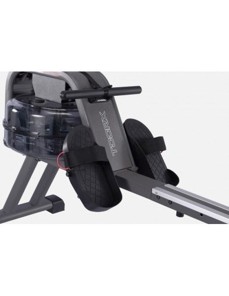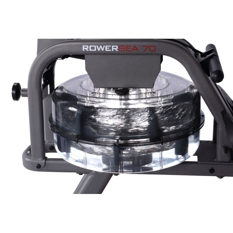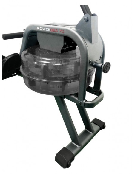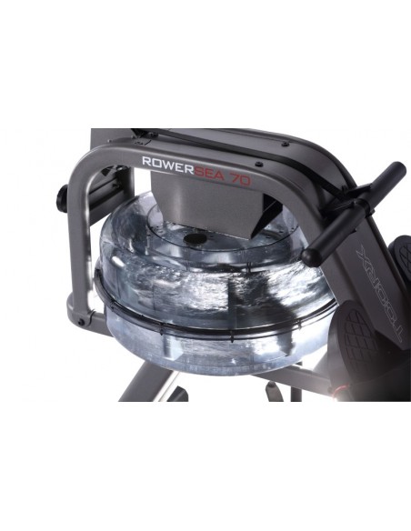 Vogatore Toorx Salvaspazio Rower Sea 70 con sistema di frenaggio idraulico progettato per simulare la dinamica di una barca in movimento sull'acqua. Lo sforzo è regolabile su 6 livelli dipendente dal livello dell'acqua.