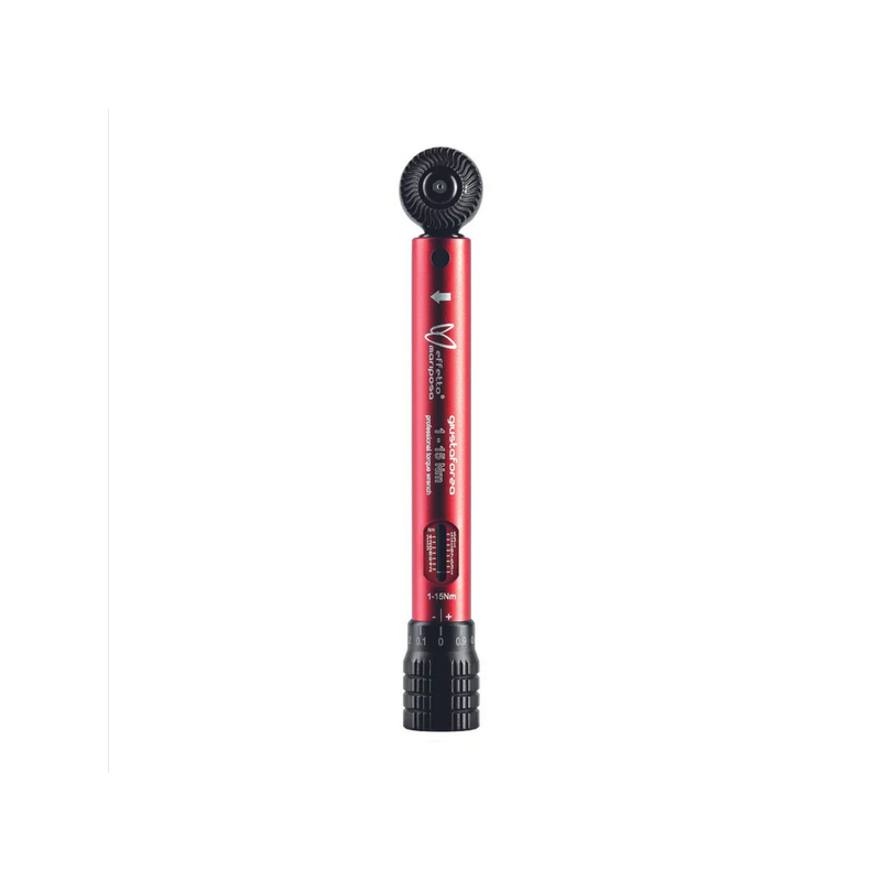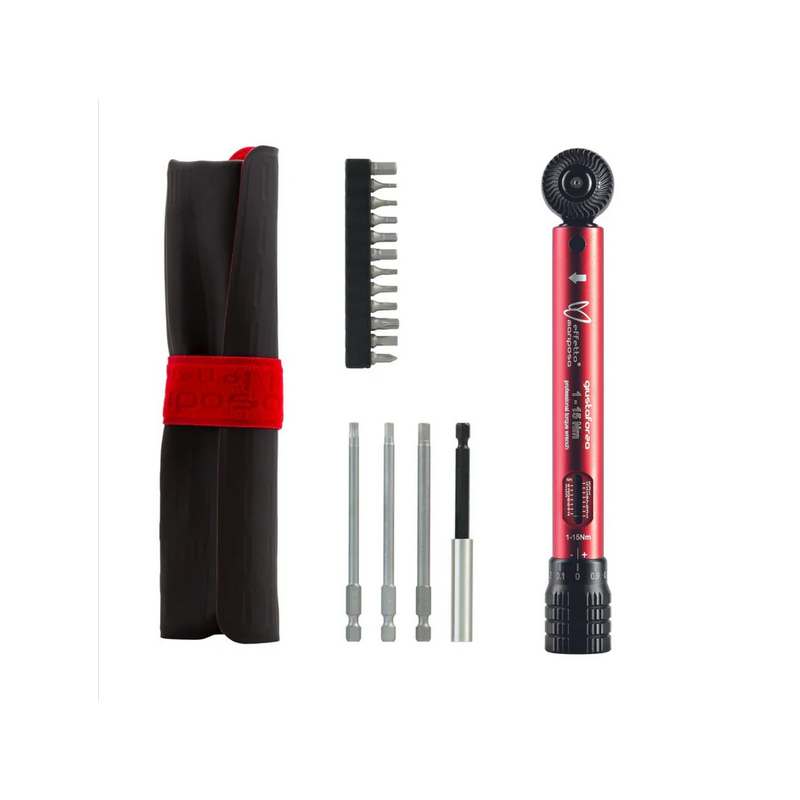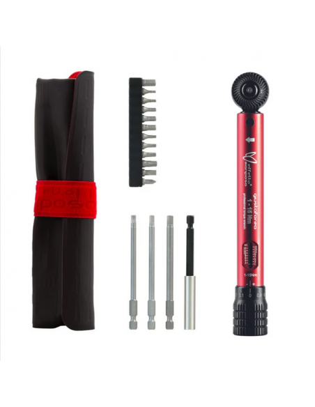 Pensata per utilizzo professionale, la chiave dinamometrica Giustaforza 1-15 Pro è anodizzata in rosso e dispone di una testa a cricchetto reversibile. La versione Deluxe è completata con inserti specifici per il ciclismo e viene fornita in una pratica custodia avvolgente.