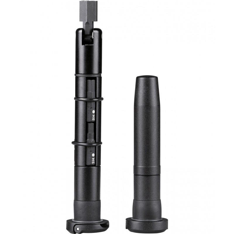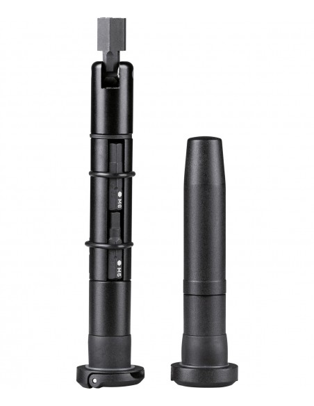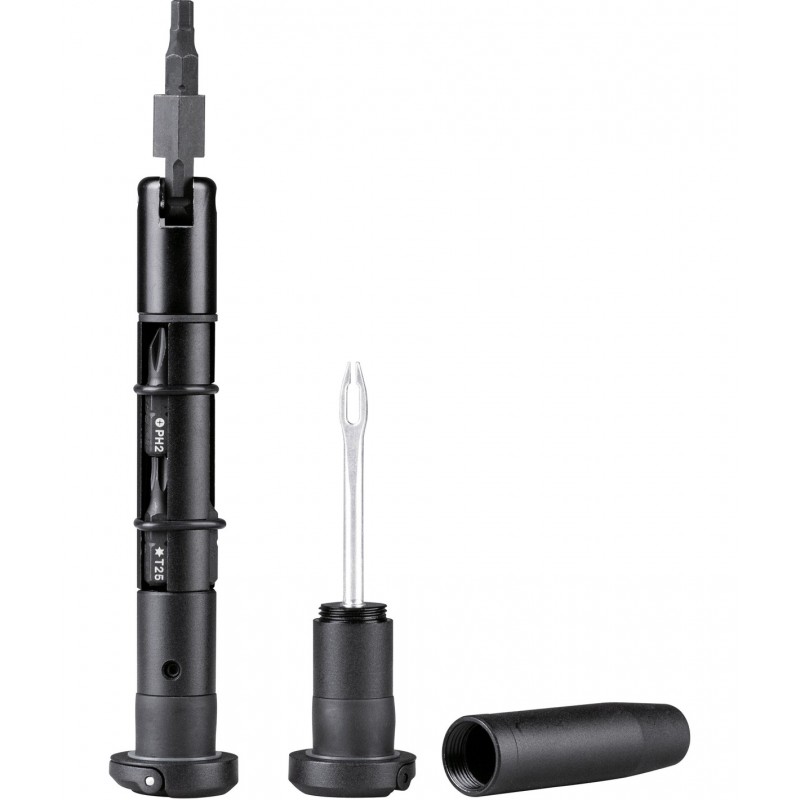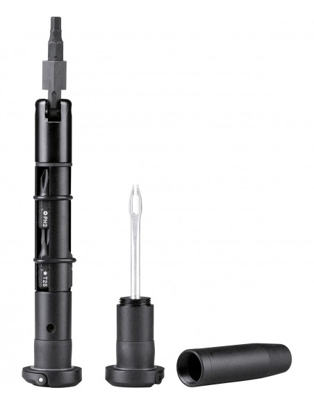 Il kit è diviso in due unità distinte. Da un lato, un portabit snodato con 7 punte intercambiabili (esagonali, Torx e cacciavite) permette di intervenire su quasi ogni vite della tua mountain bike con una leva ottimale grazie alla testa orientabile. Dall’altro, l’attrezzo per l’inserimento dei "vermicelli" tubeless ti salva nelle situazioni più critiche, permettendoti di sigillare forature importanti in pochi secondi senza smontare lo pneumatico.