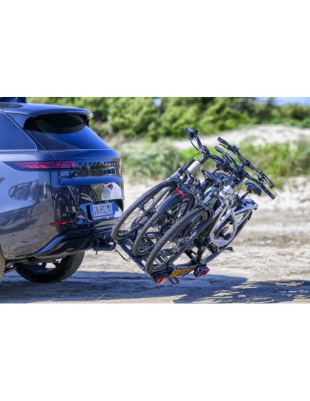 Nonostante la capacità di carico estesa, l'Orbit 3 mantiene un'ergonomia eccezionale. Il sistema tilting (basculante) è il vero cuore del prodotto: azionando un comodo pedale posto alla base, l'intera struttura si inclina verso l'esterno. Questo permette l'apertura completa del portellone posteriore dell'auto, un vantaggio fondamentale per chi viaggia con molti bagagli o attrezzatura sportiva aggiuntiva.