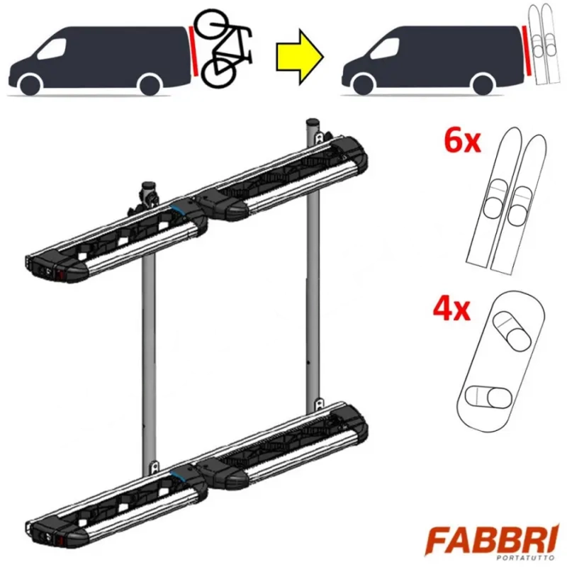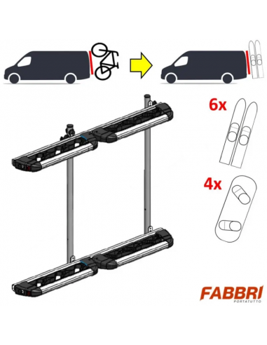 Questo kit è l'accessorio fondamentale per chi possiede un portabici posteriore Fabbri "Bici OK Van" e desidera utilizzarlo anche durante la stagione invernale. Trasforma il tuo van in un mezzo perfetto per la settimana bianca senza dover acquistare un secondo portatutto completo.