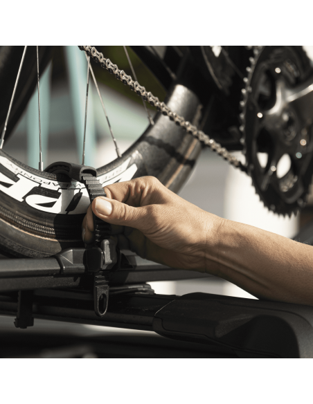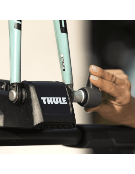 Massima sicurezza durante il trasporto grazie al pomello limitatore di coppia Thule AcuTight e al sistema di fissaggio a forcella.